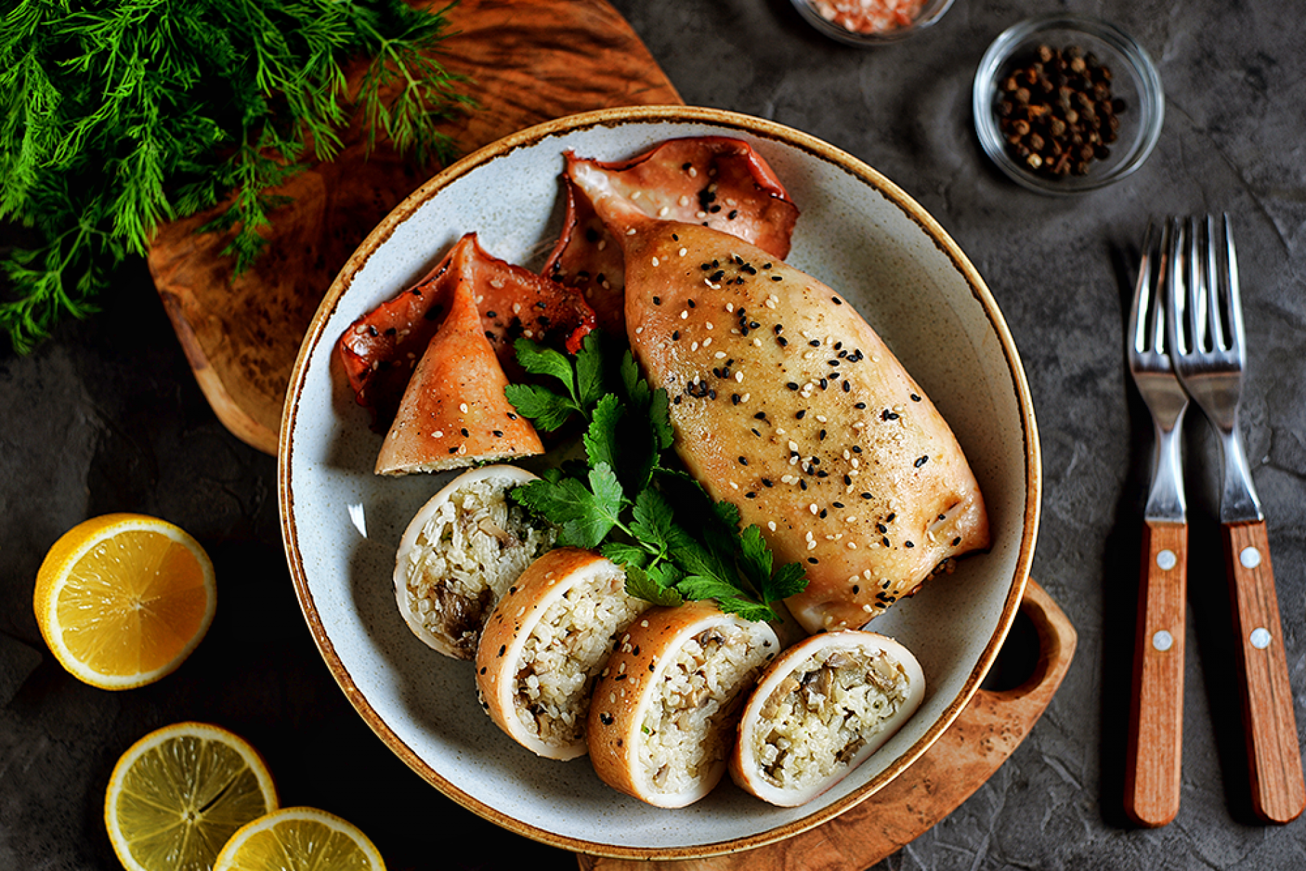 - .Purifiez le riz et lavez-le à l'eau froide dans une passoire, faites bouillir deux œufs et hachez-les, hachez le persil et les oignons, mélangez-les avec les morceaux et les ailes des calamars, le fromage, les œufs restants, le poivre et le sel et farcissez les calamars avec.